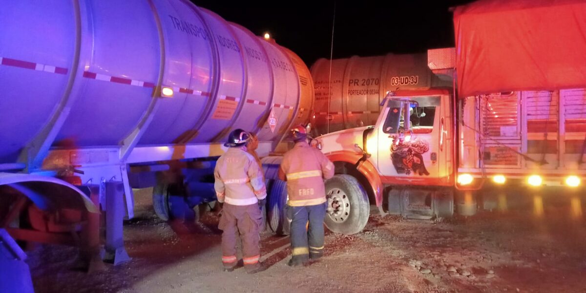 Trancoso, Zac.- La noche de este viernes, se registró un aparatoso accidente sobre la carretera Federal 45, a la altura del municipio de Trancoso, con dirección hacia Zacatecas. El incidente involucró un tráiler doble articulado que transportaba gasolina y un camión tipo torton, que colisionaron de forma frontolateral, provocando la movilización inmediata de cuerpos de emergencia. Afortunadamente, no se reportan