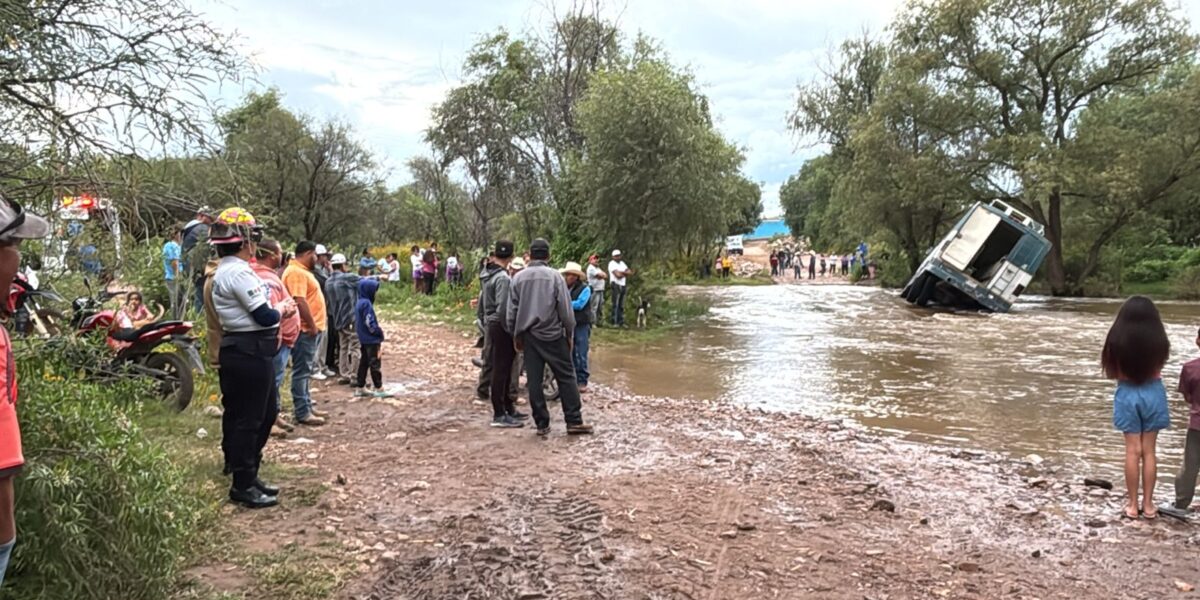 Fresnillo, Zac.- La tarde de este viernes, se registró un aparatoso accidente en la comunidad de Montemariana, cuando un camión de la empresa Romo intentó cruzar un vado, siendo arrastrado por la corriente del arroyo. De acuerdo con el reporte, el conductor no logró distinguir la profundidad del cauce y el vehículo terminó en una de las partes más hondas