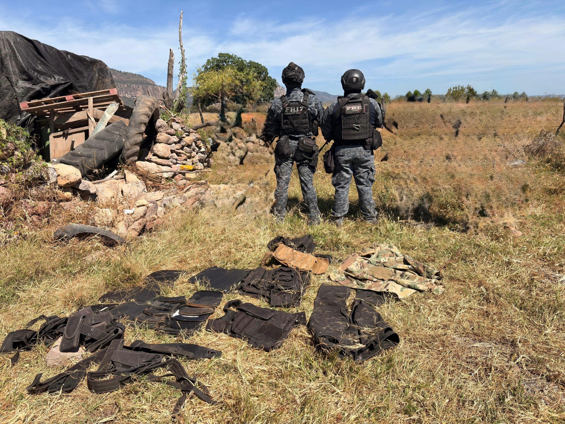 – Cinco placas balísticas, chalecos, fornituras, rodilleras y demás equipo táctico.