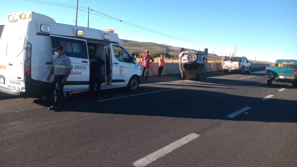 Villanueva, Zac.- Personal de rescate y paramédicos de la Coordinación Municipal de Protección Civil, al mando de Juan Antonio Muñoz Heredia, atendieron un choque contra el muro de contención y volcadura, en hechos que ocurrieron sobre la carretera federal 54 en el kilómetro 290 en esta municipalidad.
